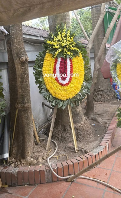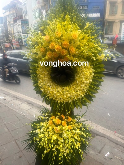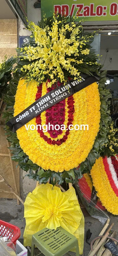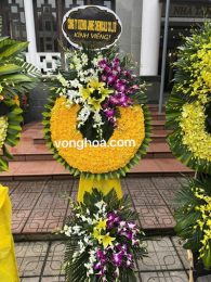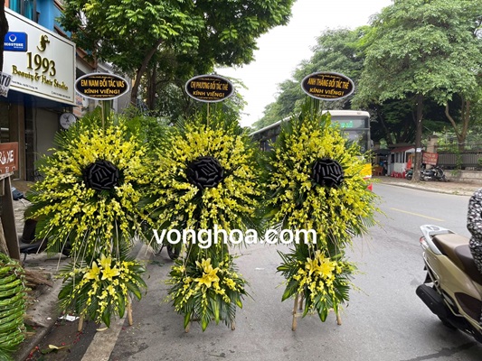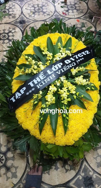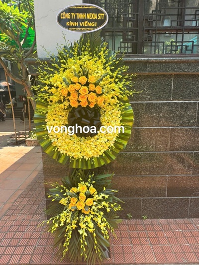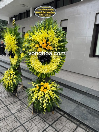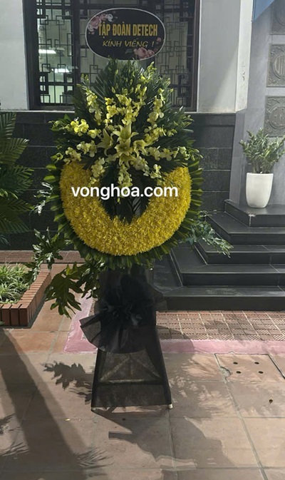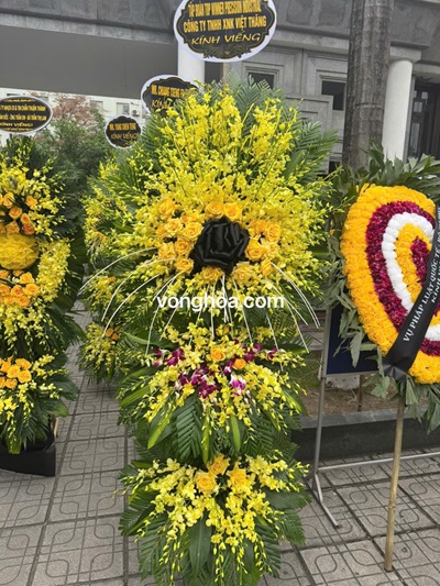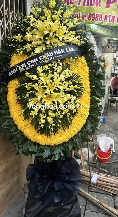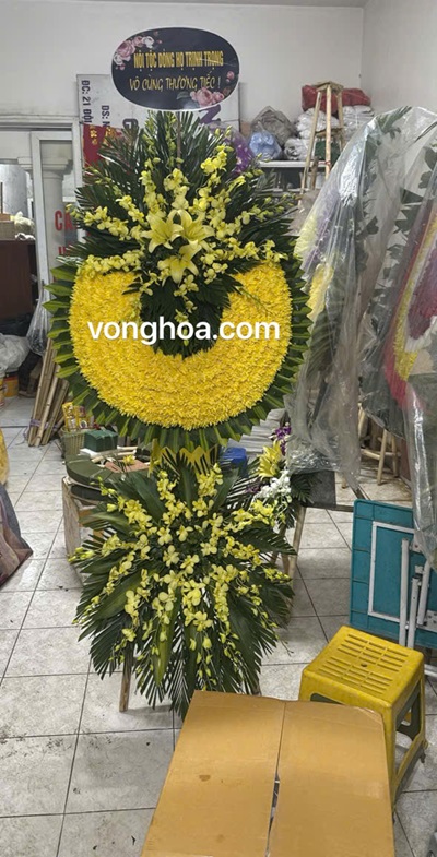Vòng hoa thường được kết hợp từ hoa cúc vàng, hoa lan vàng, hoa mút và hoa ly vàng, tạo nên tổng thể hài hòa, thanh lịch và phù hợp với không khí tang lễ trang trọng.