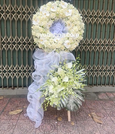 Vòng hoa màu trắng kiểu tròn Sài Gòn là mẫu hoa viếng mang nét hiện đại nhưng vẫn giữ được sự trang nghiêm cần có trong tang lễ. Toàn bộ vòng được cắm theo dáng tròn kín, sử dụng hoa trắng chủ đạo như lan trắng, cúc trắng hoặc hồng trắng, tạo nên vẻ thanh khiết và sâu lắng. Kiểu hoa tròn Sài Gòn được ưa chuộng nhờ bố cục gọn gàng, hoa được cắm dày tay, nhìn đầy đặn và sang trọng.