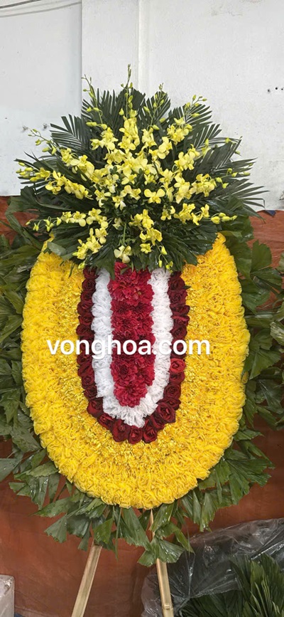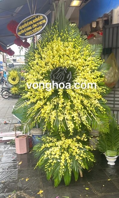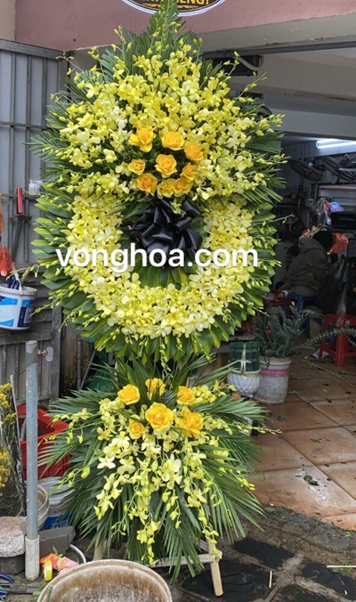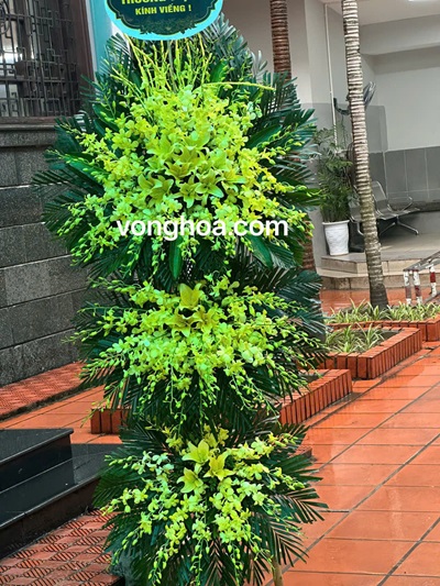 Lẵng hoa lan vàng 2 tầng là mẫu hoa tang lễ được ưa chuộng tại khu vực Nhà tang lễ Cầu Giấy, mang vẻ đẹp sang trọng và trang nghiêm. Lẵng được thiết kế theo kiểu hai tầng cân đối, sử dụng hoa lan vàng chủ đạo kết hợp cùng ly vàng, lá thiết mộc lan, lá cau – tạo nên tổng thể tự nhiên, thanh lịch mà vẫn đầy ý nghĩa.