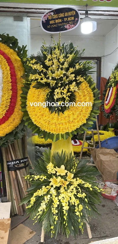 Kiểu dáng vòng tròn lớn một tầng hoặc hai tầng thường được lựa chọn để viếng tại Nhà tang lễ Cầu Giấy, thể hiện sự thành kính và lòng tưởng nhớ sâu sắc đến người đã khuất. Đây là mẫu hoa mang phong cách phúng viếng miền Nam, hiện đại mà vẫn giữ trọn nét truyền thống.